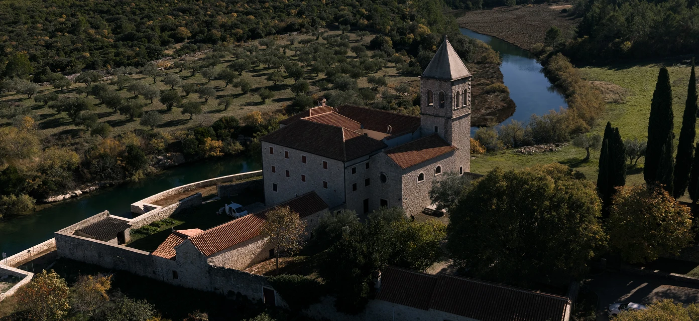 The monastery is located in the village of Karin, at the mouth of the Karišnica River into the Karin Sea. Enclosed by high, almost defensive walls, it forms a tranquil sacred space within the natural landscape. The late Baroque monastery was built between the 15th and 18th centuries.