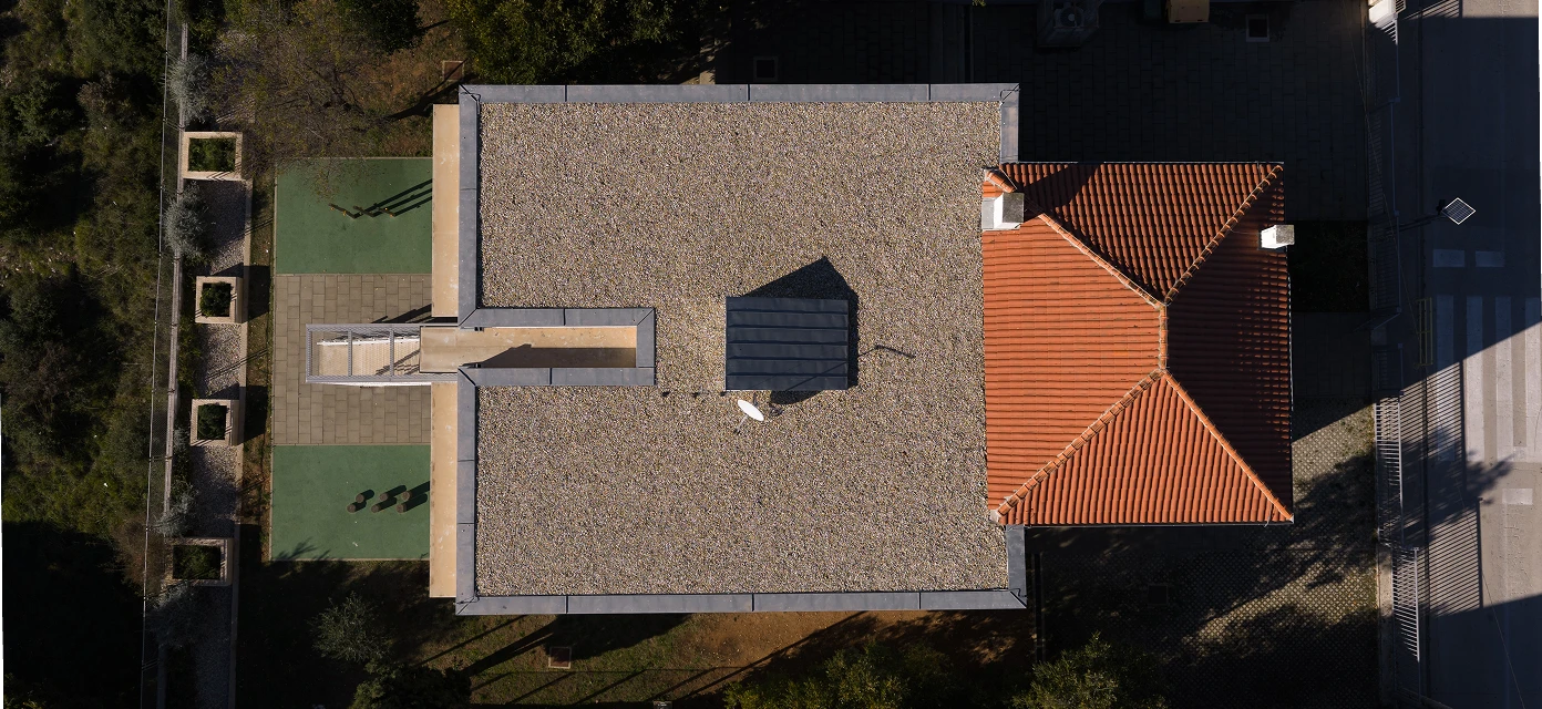 Due to the already limited school grounds, the extension was built on the upper floor to free up as much outdoor space as possible. The new addition is a modernist white volume, resting on the existing dark base and steel elements (columns and staircase) that touch the ground.